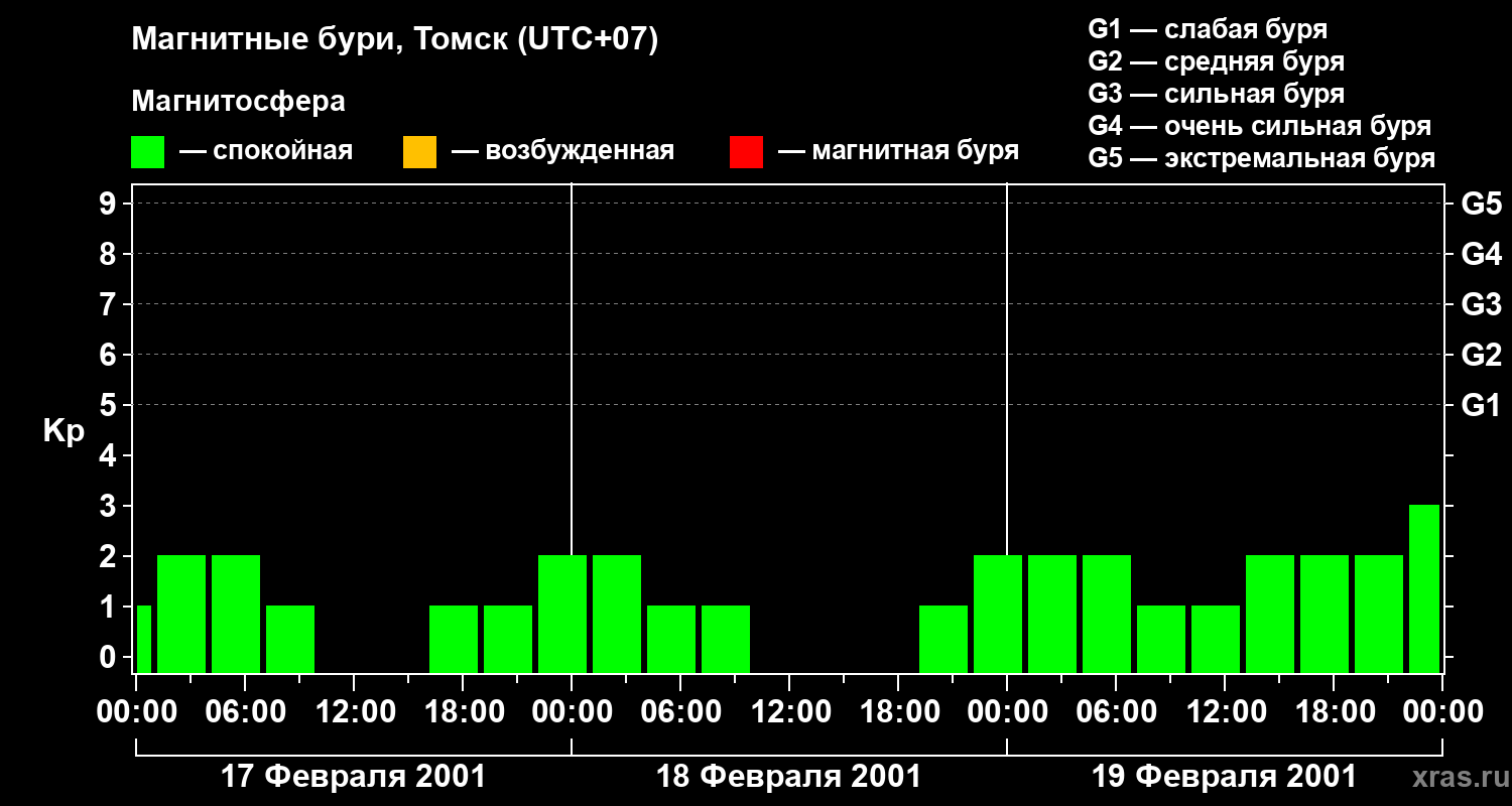 Изменения геомагнитного индекса Kp с 17 по 19 февраля 2001 года для средних широт