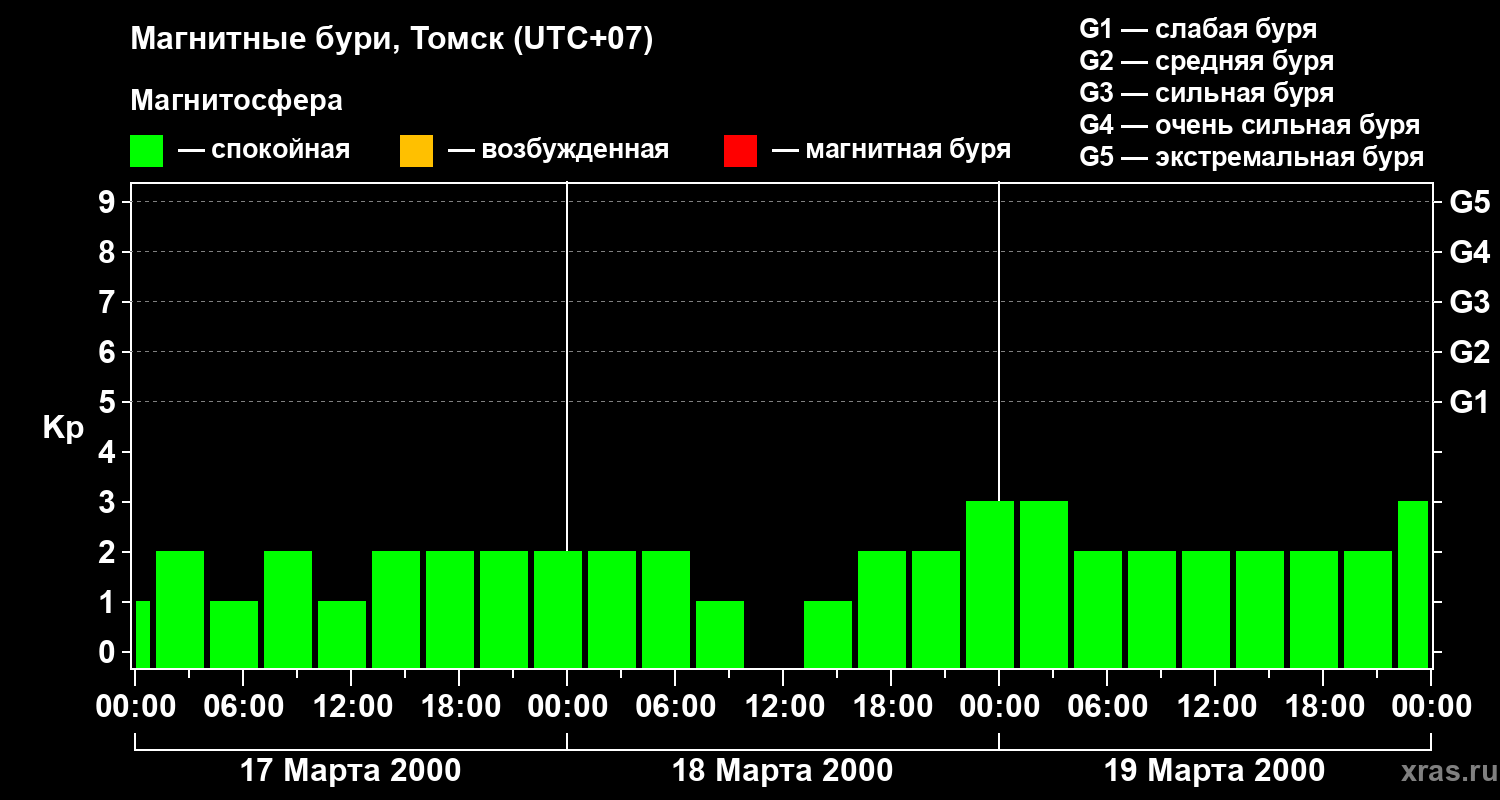 Изменения геомагнитного индекса Kp с 17 по 19 марта 2000 года для средних широт