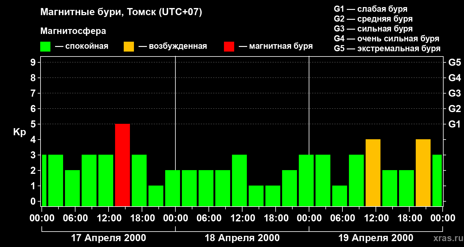 Изменения геомагнитного индекса Kp с 17 по 19 апреля 2000 года для средних широт