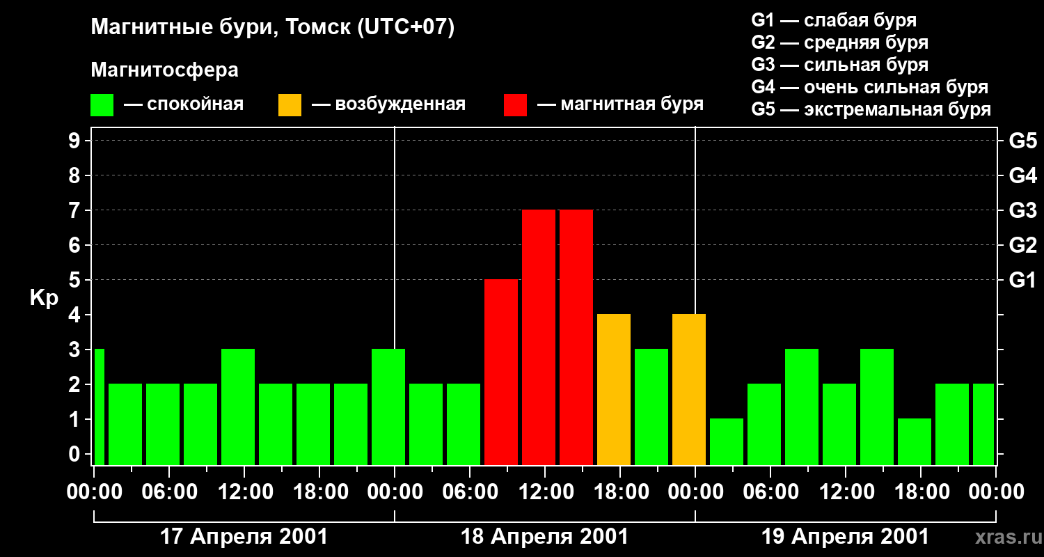Изменения геомагнитного индекса Kp с 17 по 19 апреля 2001 года для средних широт