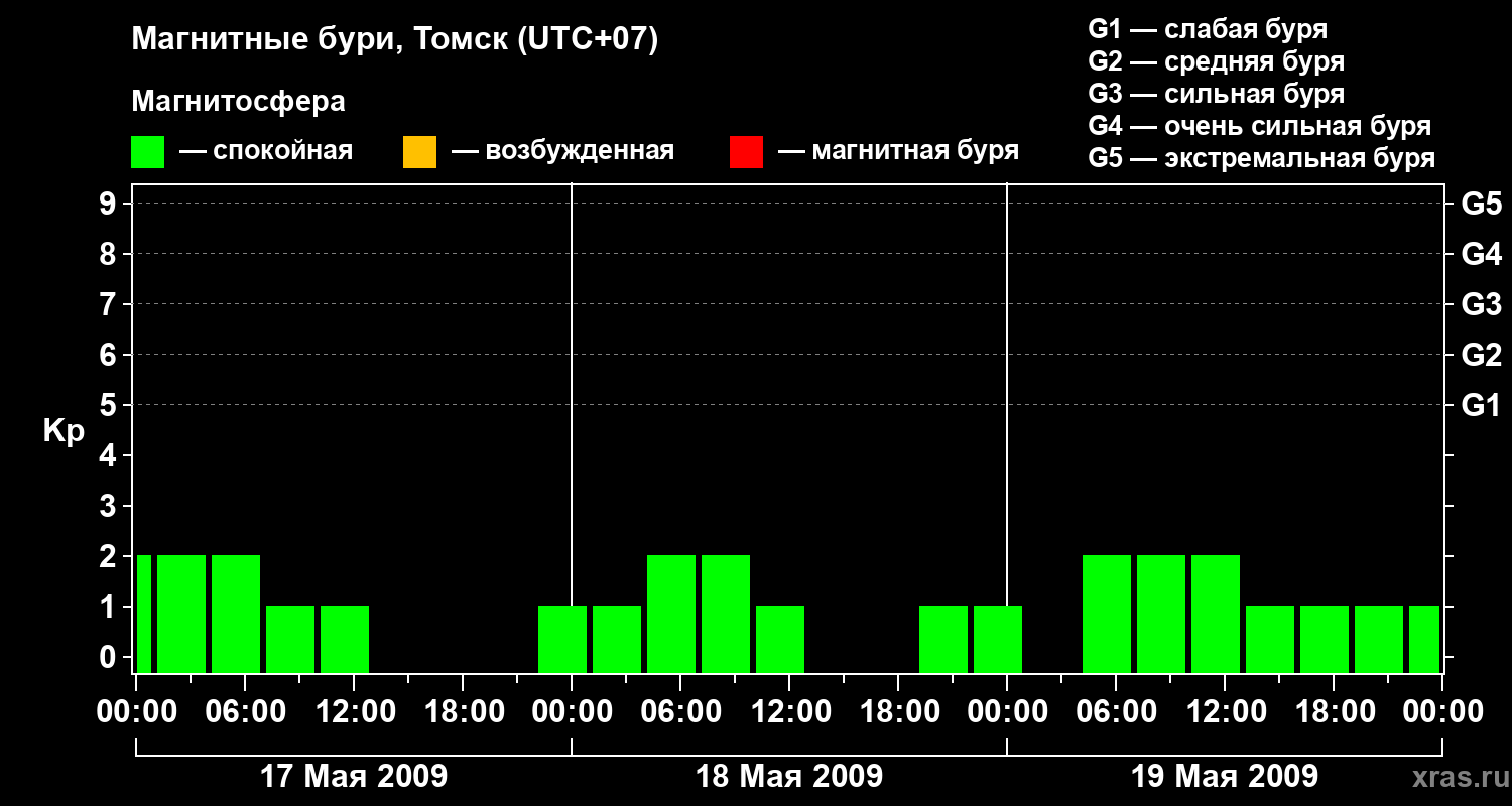 Изменения геомагнитного индекса Kp с 17 по 19 мая 2009 года для средних широт