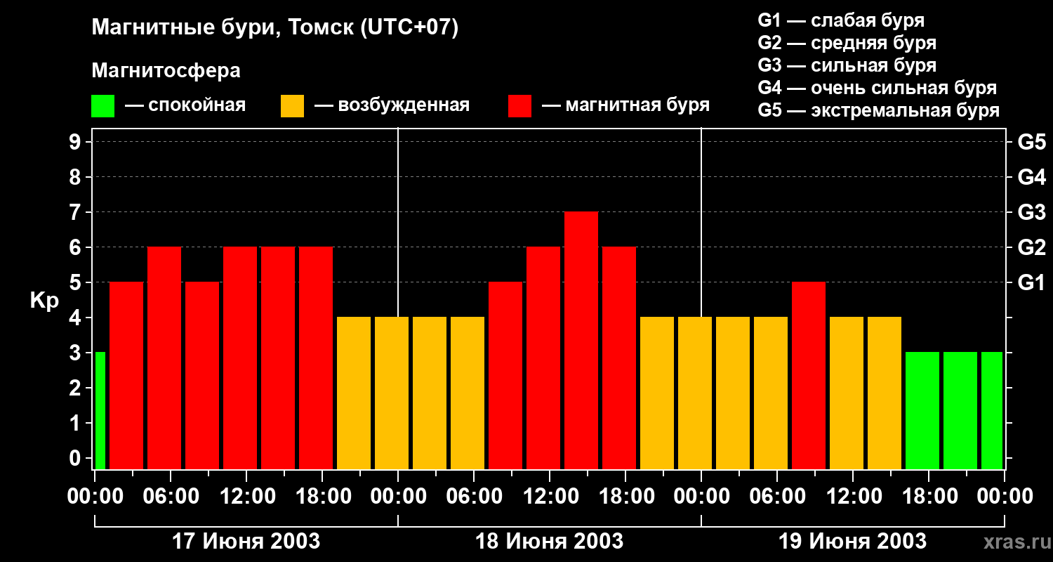Изменения геомагнитного индекса Kp с 17 по 19 июня 2003 года для средних широт