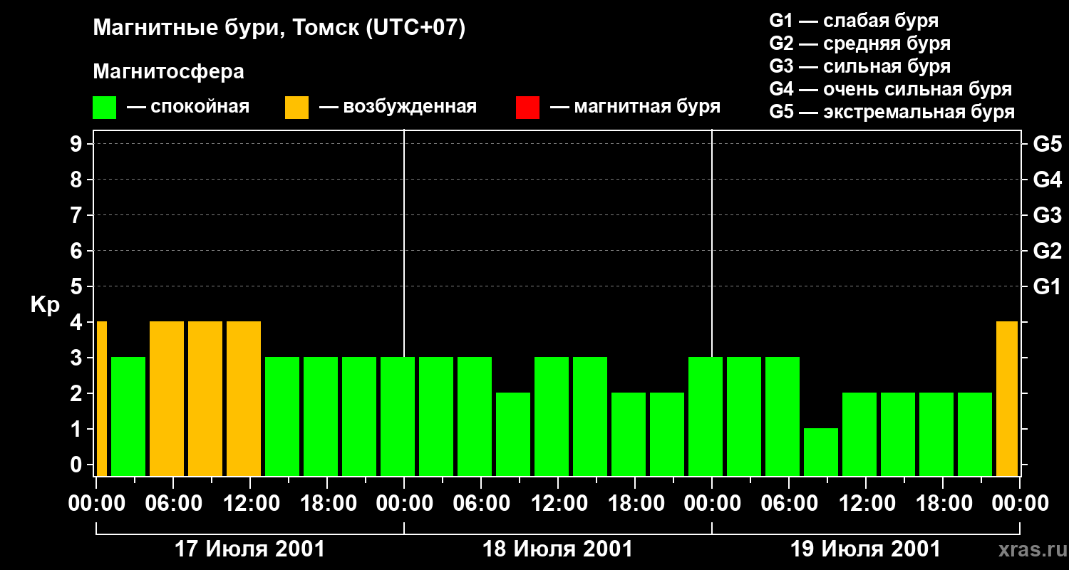Изменения геомагнитного индекса Kp с 17 по 19 июля 2001 года для средних широт
