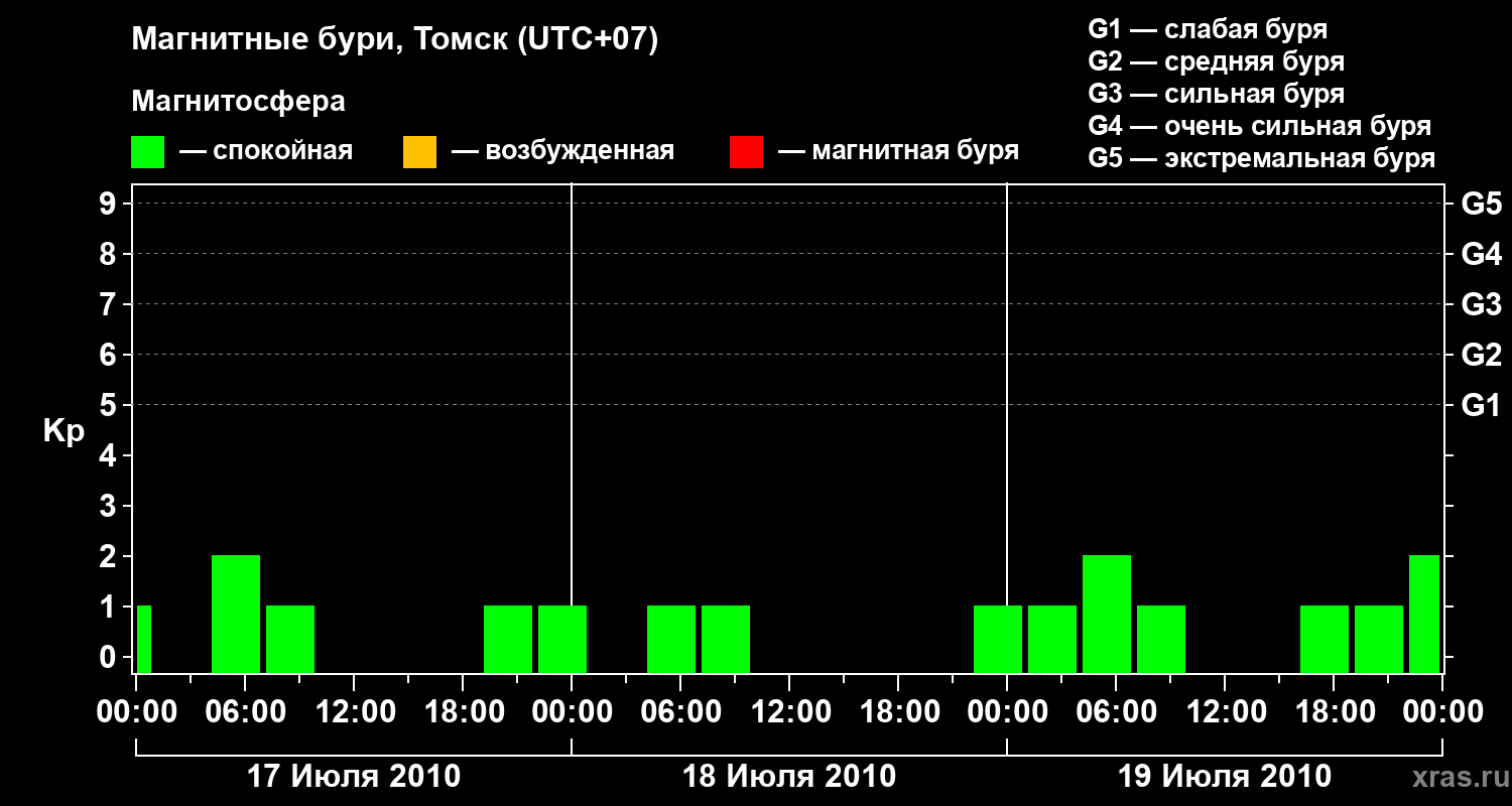 Изменения геомагнитного индекса Kp с 17 по 19 июля 2010 года для средних широт