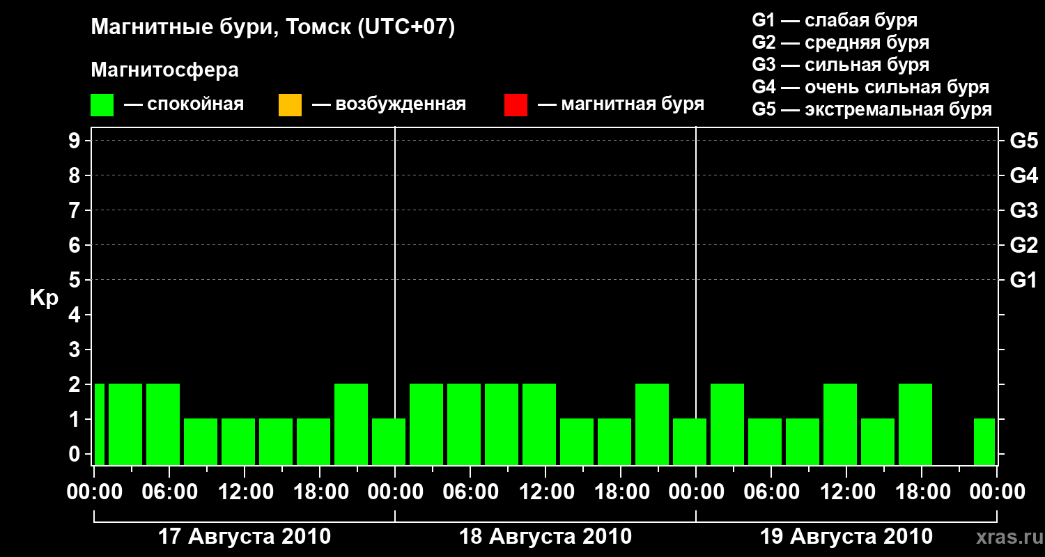 Изменения геомагнитного индекса Kp с 17 по 19 августа 2010 года для средних широт