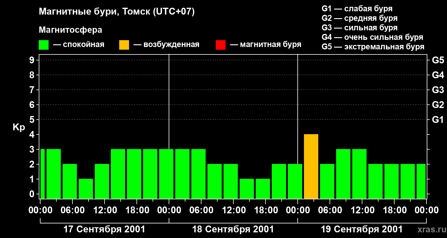 Изменения геомагнитного индекса Kp с 17 по 19 сентября 2001 года для средних широт