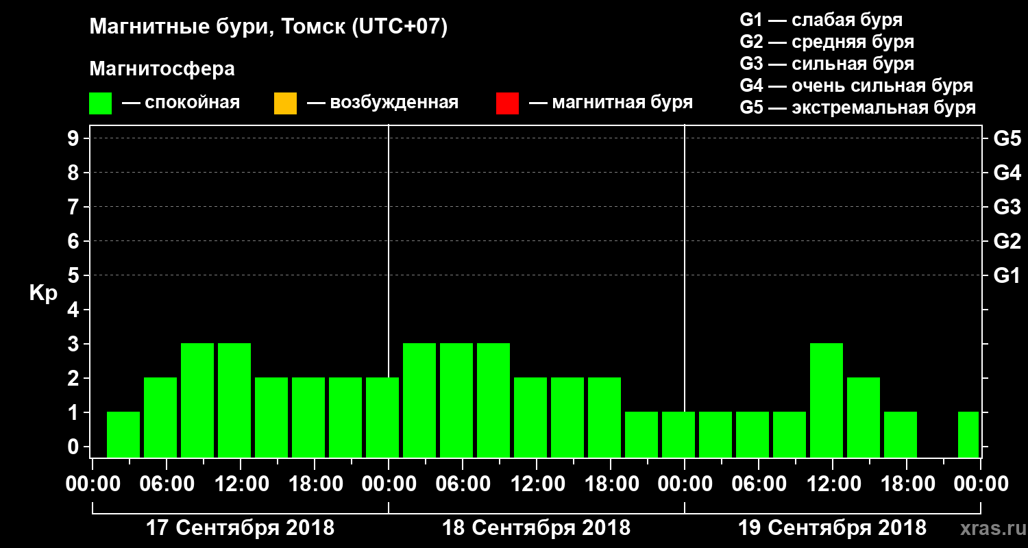 Изменения геомагнитного индекса Kp с 17 по 19 сентября 2018 года для средних широт