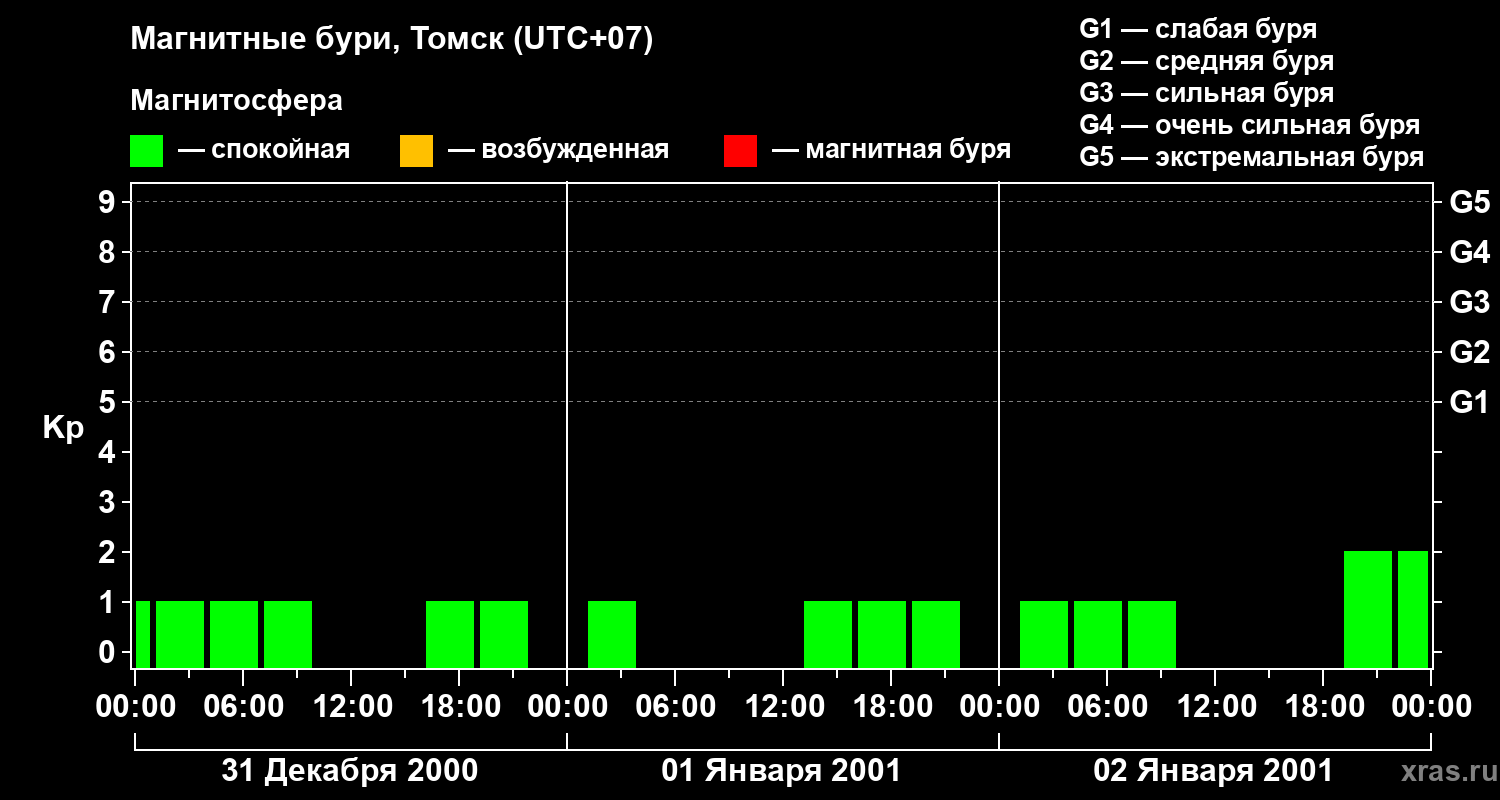 Изменения геомагнитного индекса Kp с 31 декабря 2000 года по 2 января 2001 года для средних широт