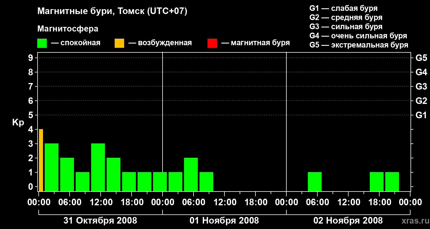Изменения геомагнитного индекса Kp с 31 октября по 2 ноября 2008 года для средних широт