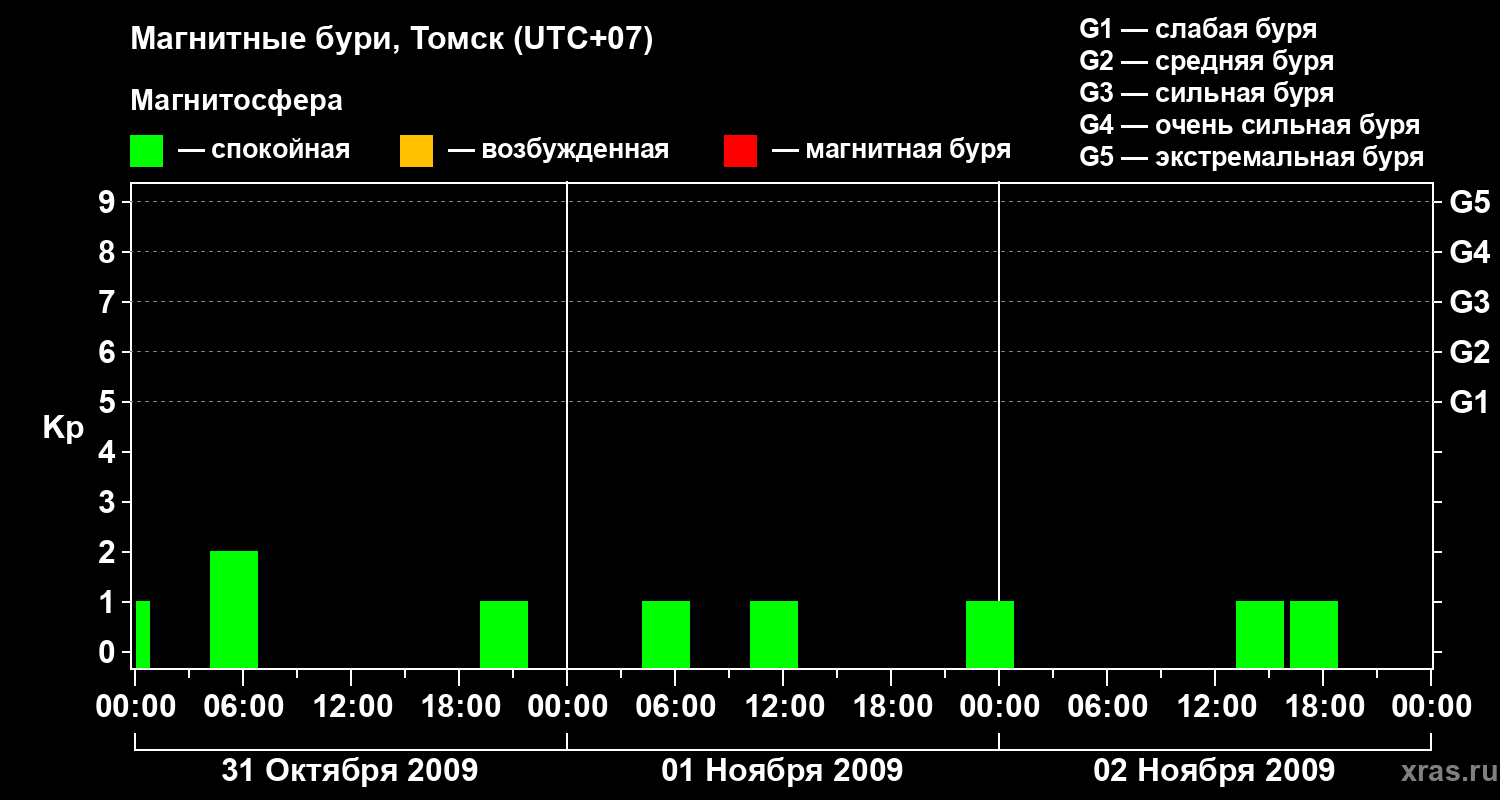 Изменения геомагнитного индекса Kp с 31 октября по 2 ноября 2009 года для средних широт