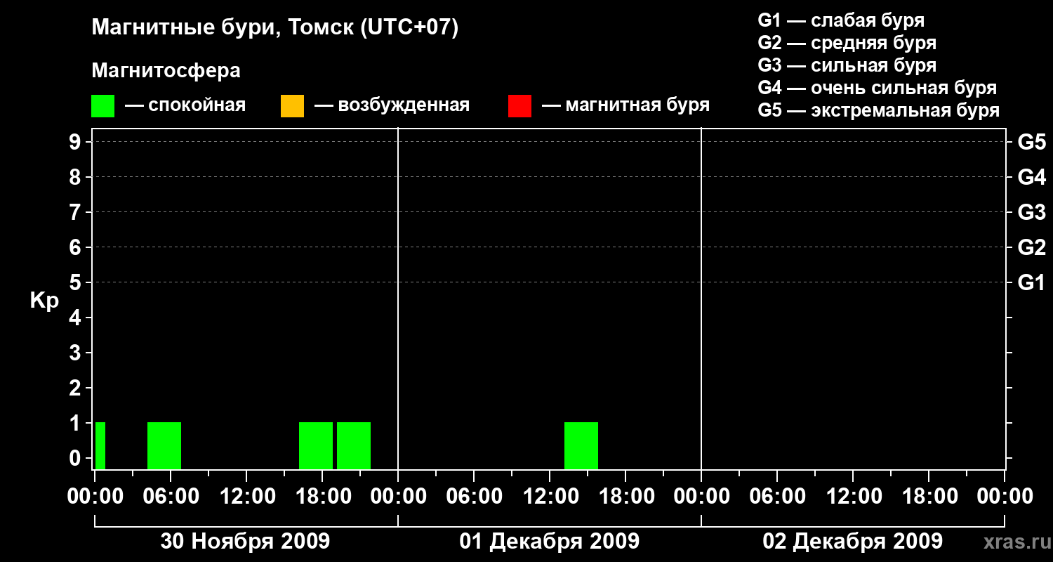 Изменения геомагнитного индекса Kp с 30 ноября по 2 декабря 2009 года для средних широт