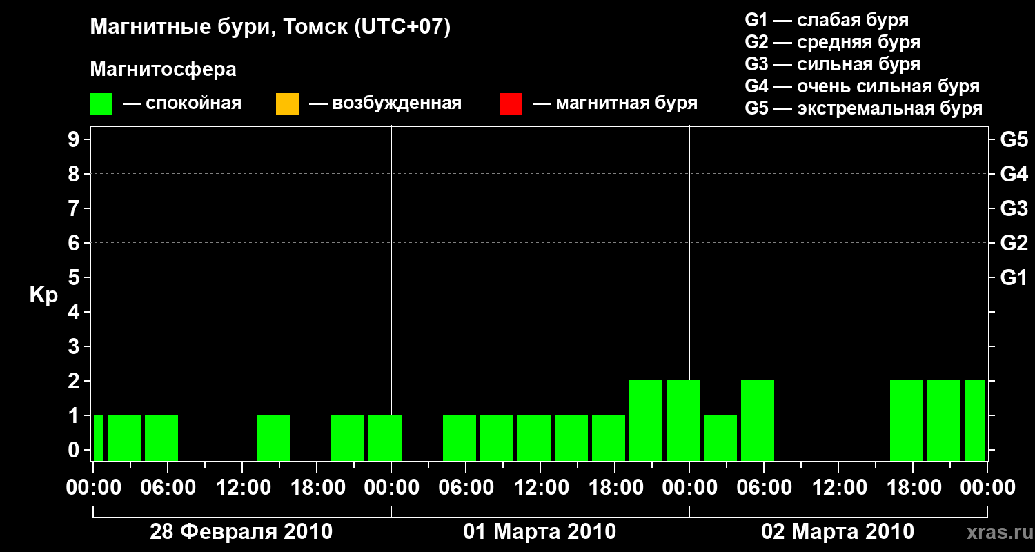 Изменения геомагнитного индекса Kp с 28 февраля по 2 марта 2010 года для средних широт