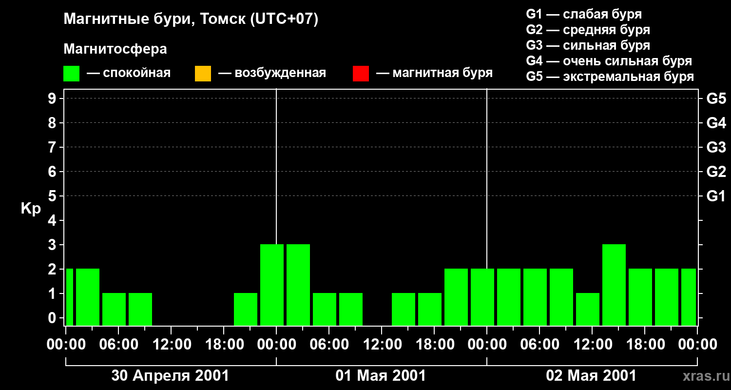 Изменения геомагнитного индекса Kp с 30 апреля по 2 мая 2001 года для средних широт