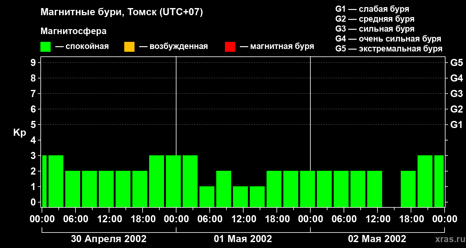 Изменения геомагнитного индекса Kp с 30 апреля по 2 мая 2002 года для средних широт