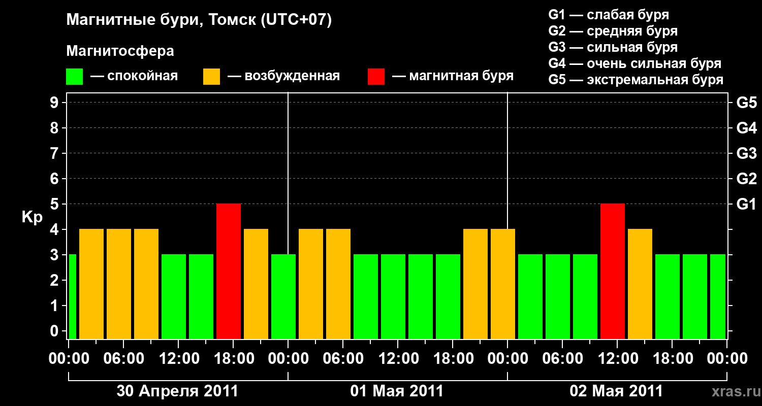 Изменения геомагнитного индекса Kp с 30 апреля по 2 мая 2011 года для средних широт