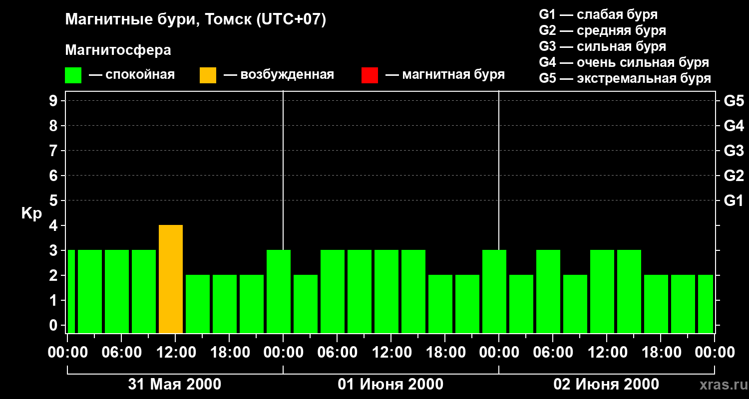 Изменения геомагнитного индекса Kp с 31 мая по 2 июня 2000 года для средних широт
