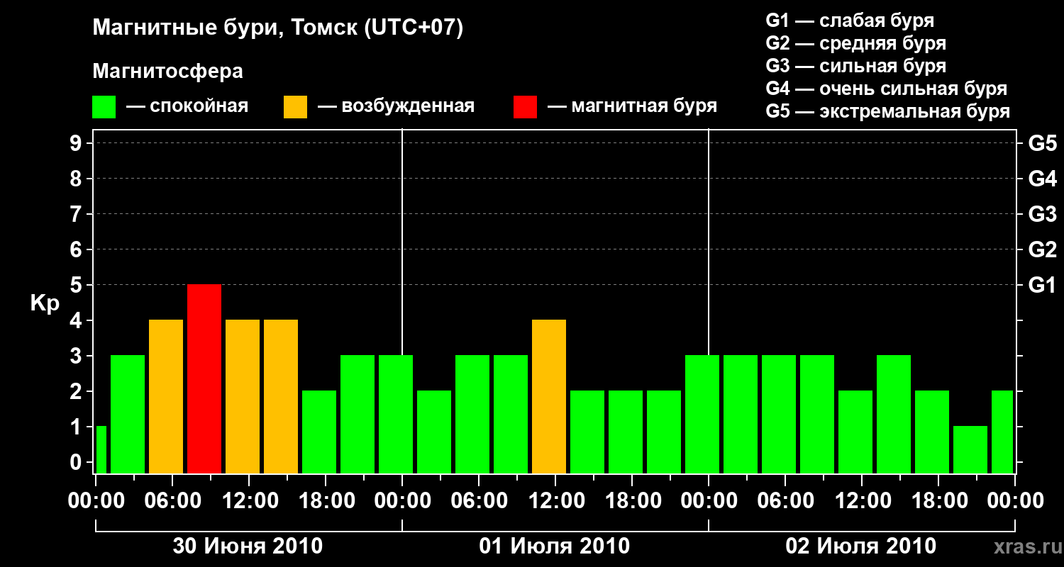 Изменения геомагнитного индекса Kp с 30 июня по 2 июля 2010 года для средних широт