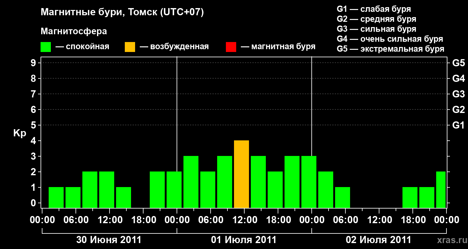 Изменения геомагнитного индекса Kp с 30 июня по 2 июля 2011 года для средних широт
