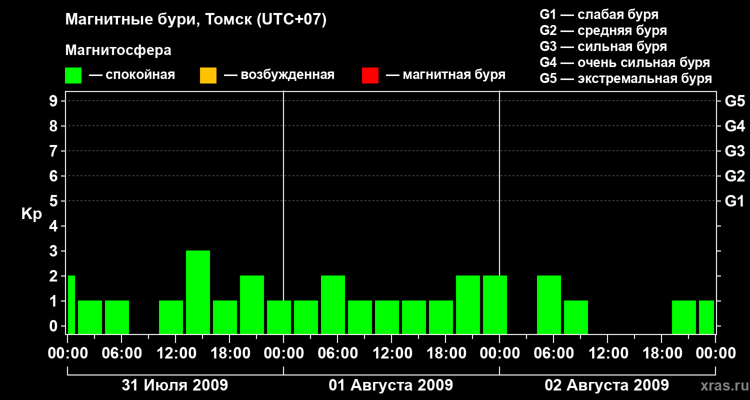 Изменения геомагнитного индекса Kp с 31 июля по 2 августа 2009 года для средних широт