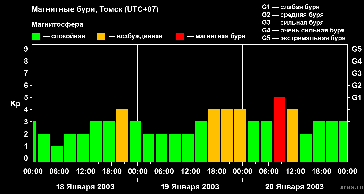 Изменения геомагнитного индекса Kp с 18 по 20 января 2003 года для средних широт