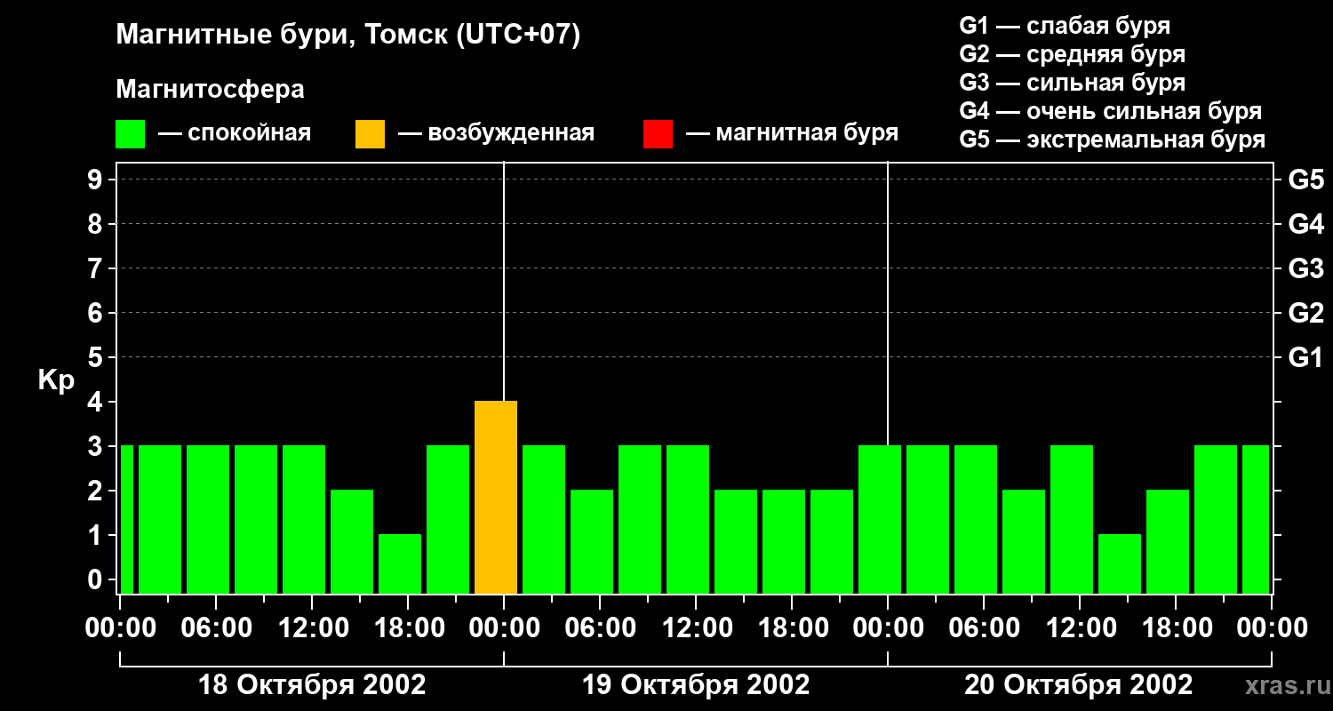 Изменения геомагнитного индекса Kp с 18 по 20 октября 2002 года для средних широт