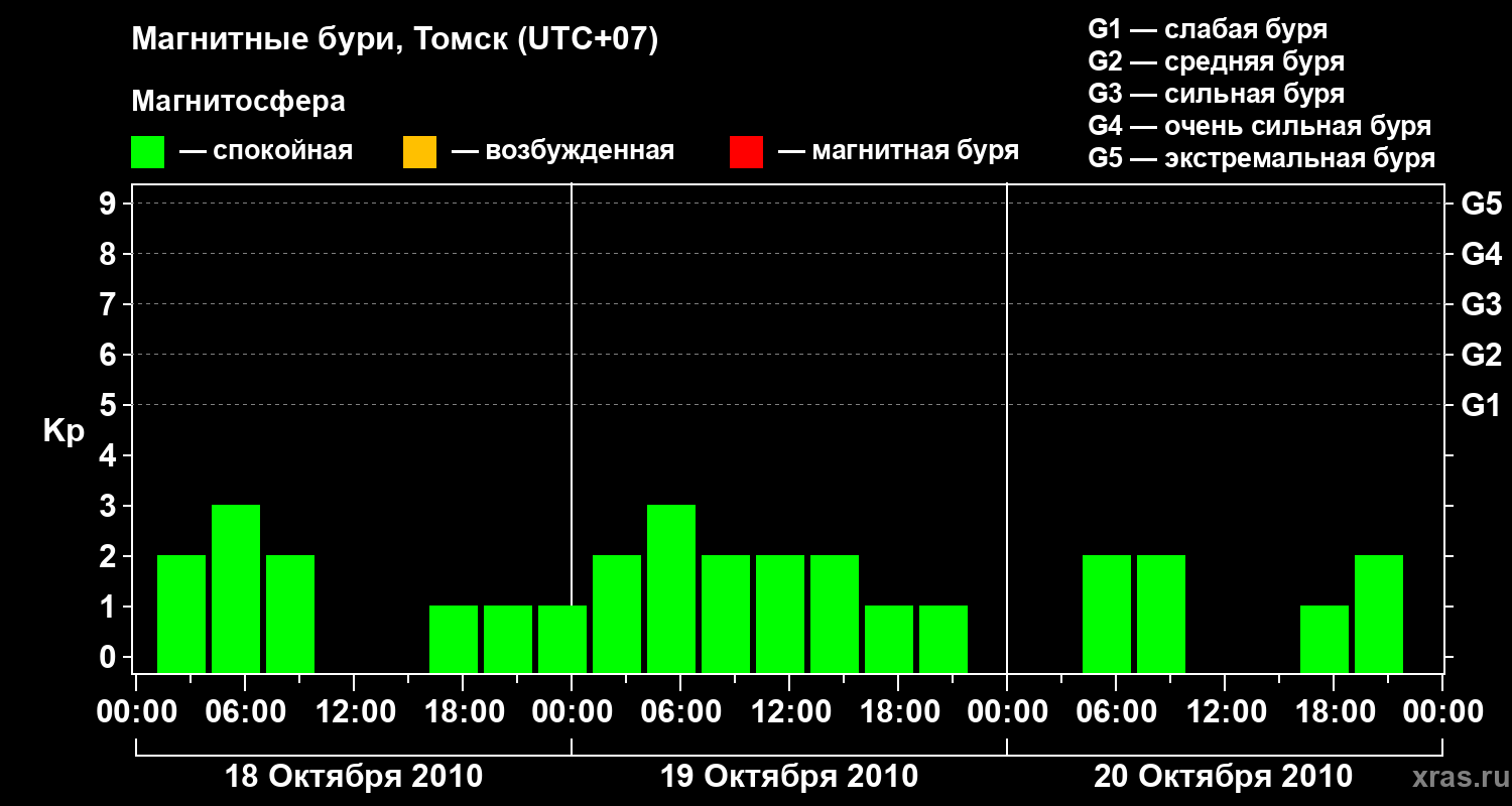 Изменения геомагнитного индекса Kp с 18 по 20 октября 2010 года для средних широт