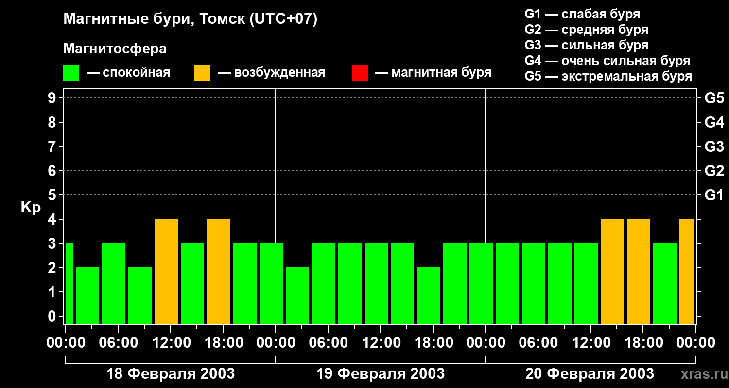 Изменения геомагнитного индекса Kp с 18 по 20 февраля 2003 года для средних широт
