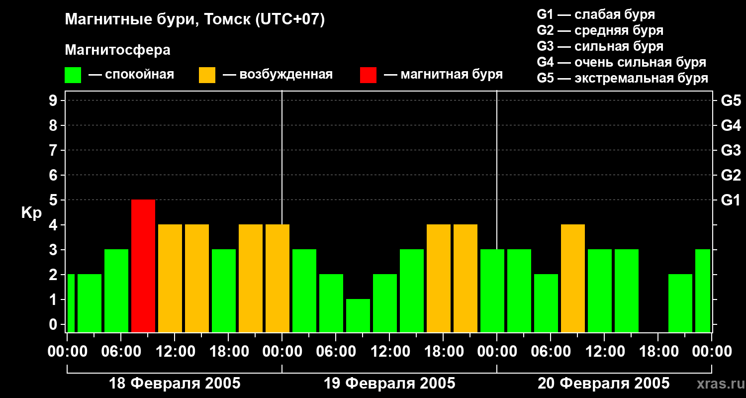 Изменения геомагнитного индекса Kp с 18 по 20 февраля 2005 года для средних широт