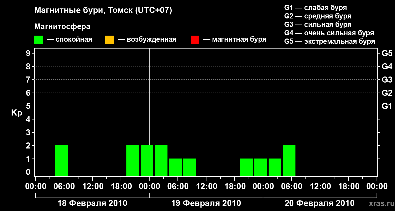 Изменения геомагнитного индекса Kp с 18 по 20 февраля 2010 года для средних широт
