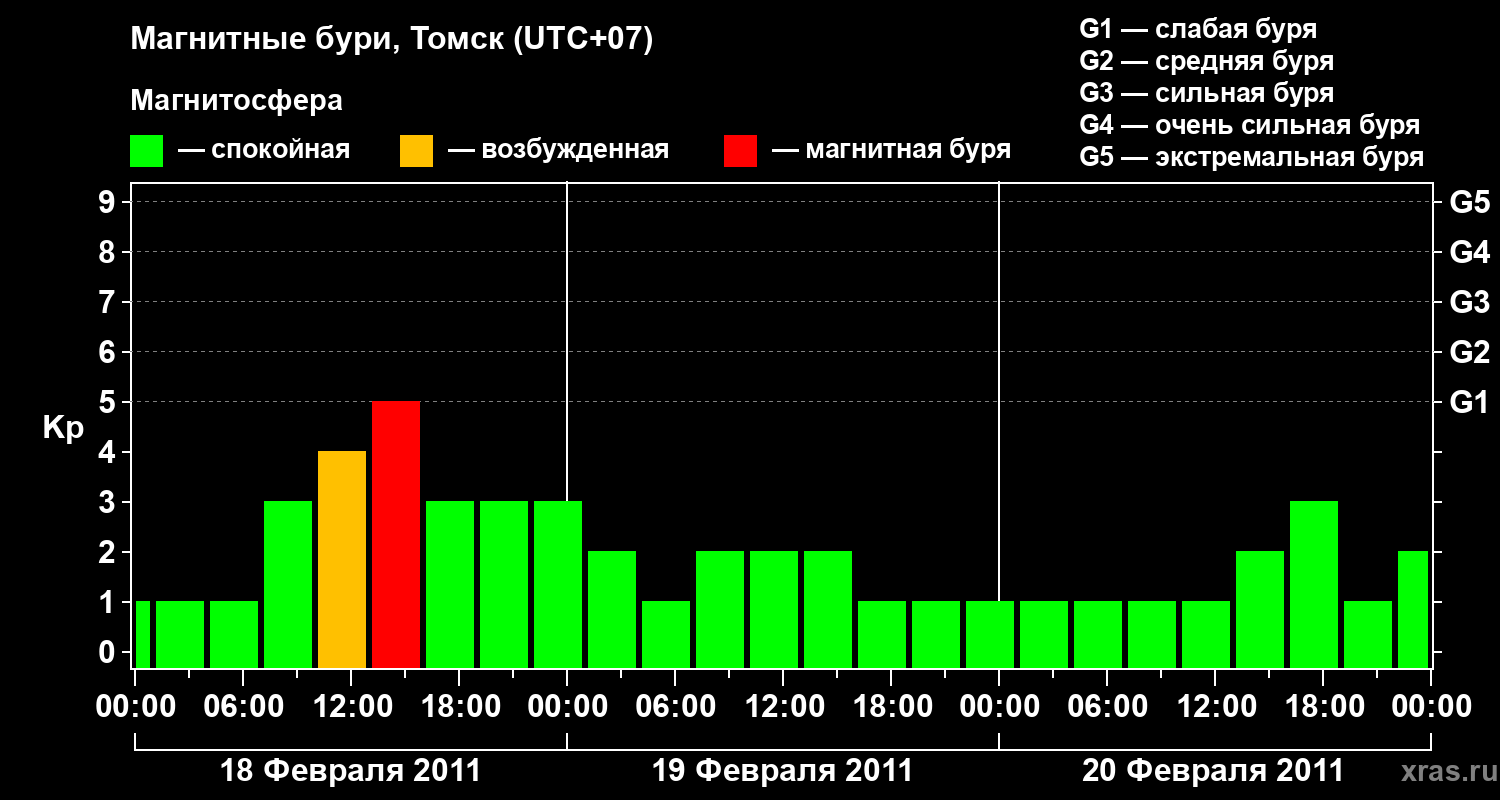 Изменения геомагнитного индекса Kp с 18 по 20 февраля 2011 года для средних широт