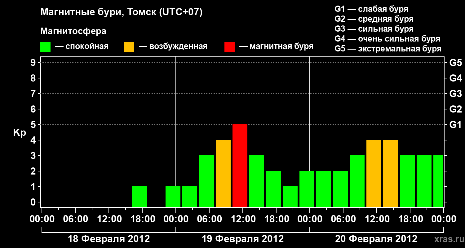 Изменения геомагнитного индекса Kp с 18 по 20 февраля 2012 года для средних широт