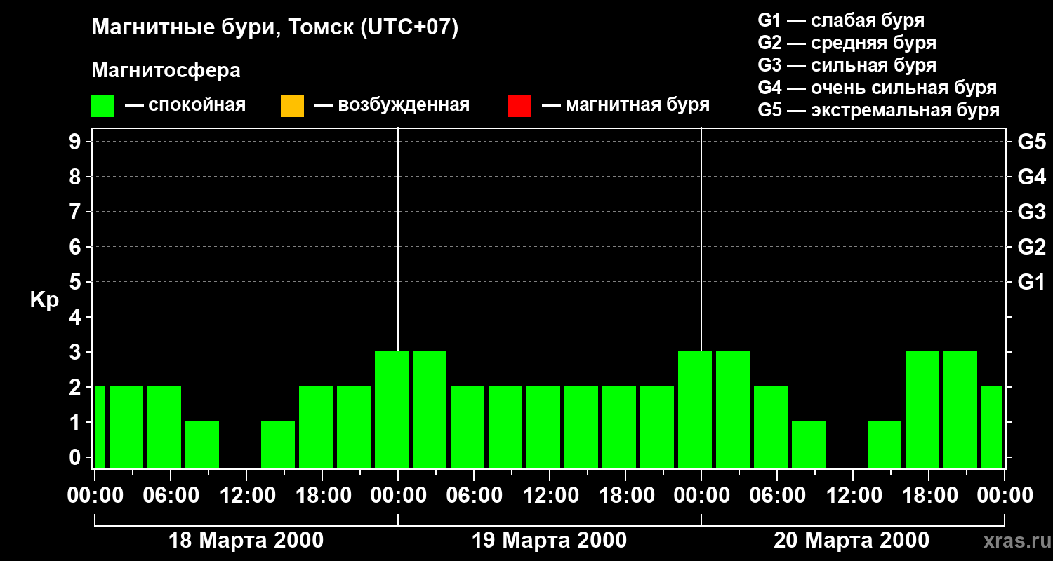 Изменения геомагнитного индекса Kp с 18 по 20 марта 2000 года для средних широт