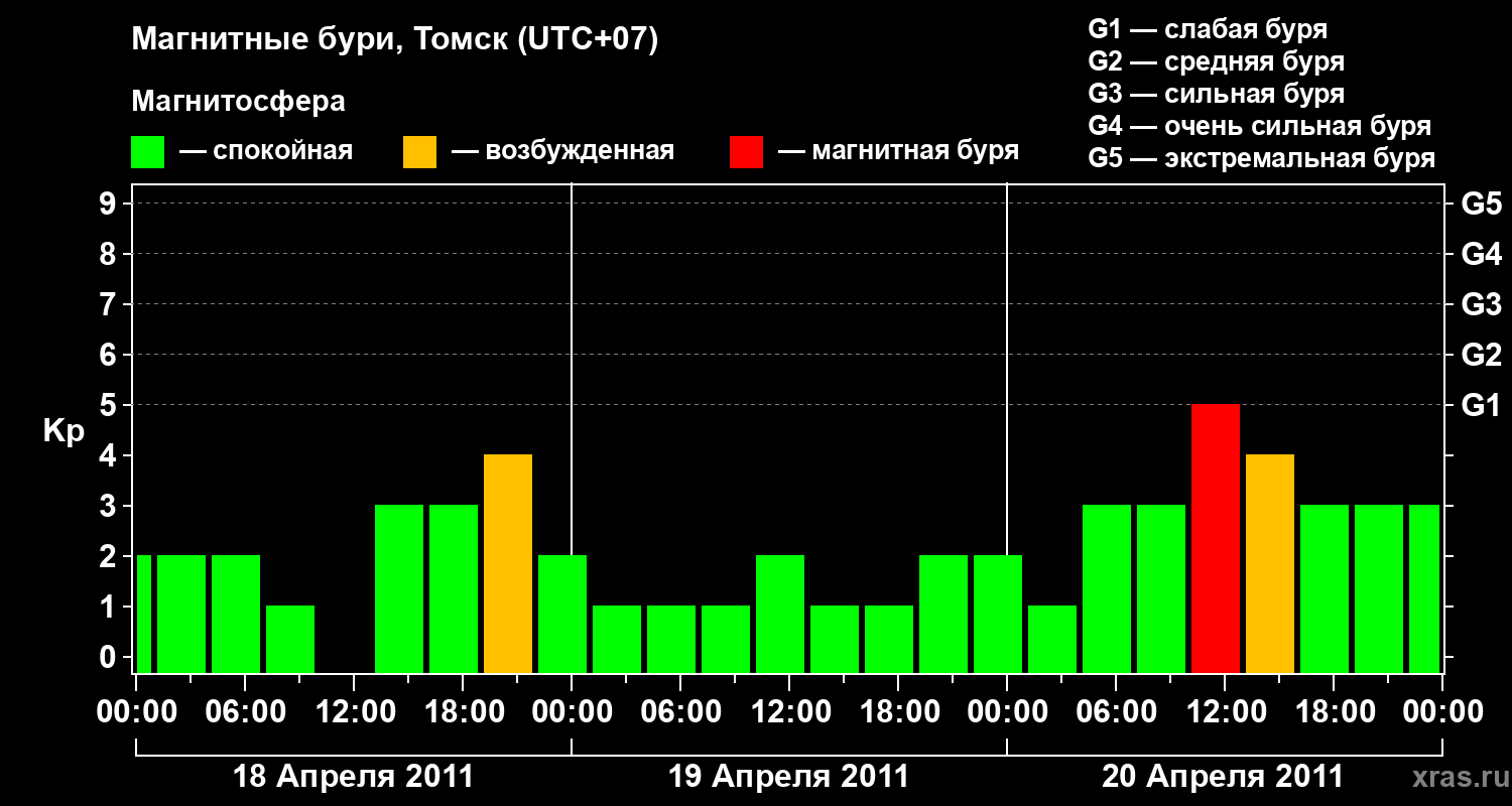 Изменения геомагнитного индекса Kp с 18 по 20 апреля 2011 года для средних широт
