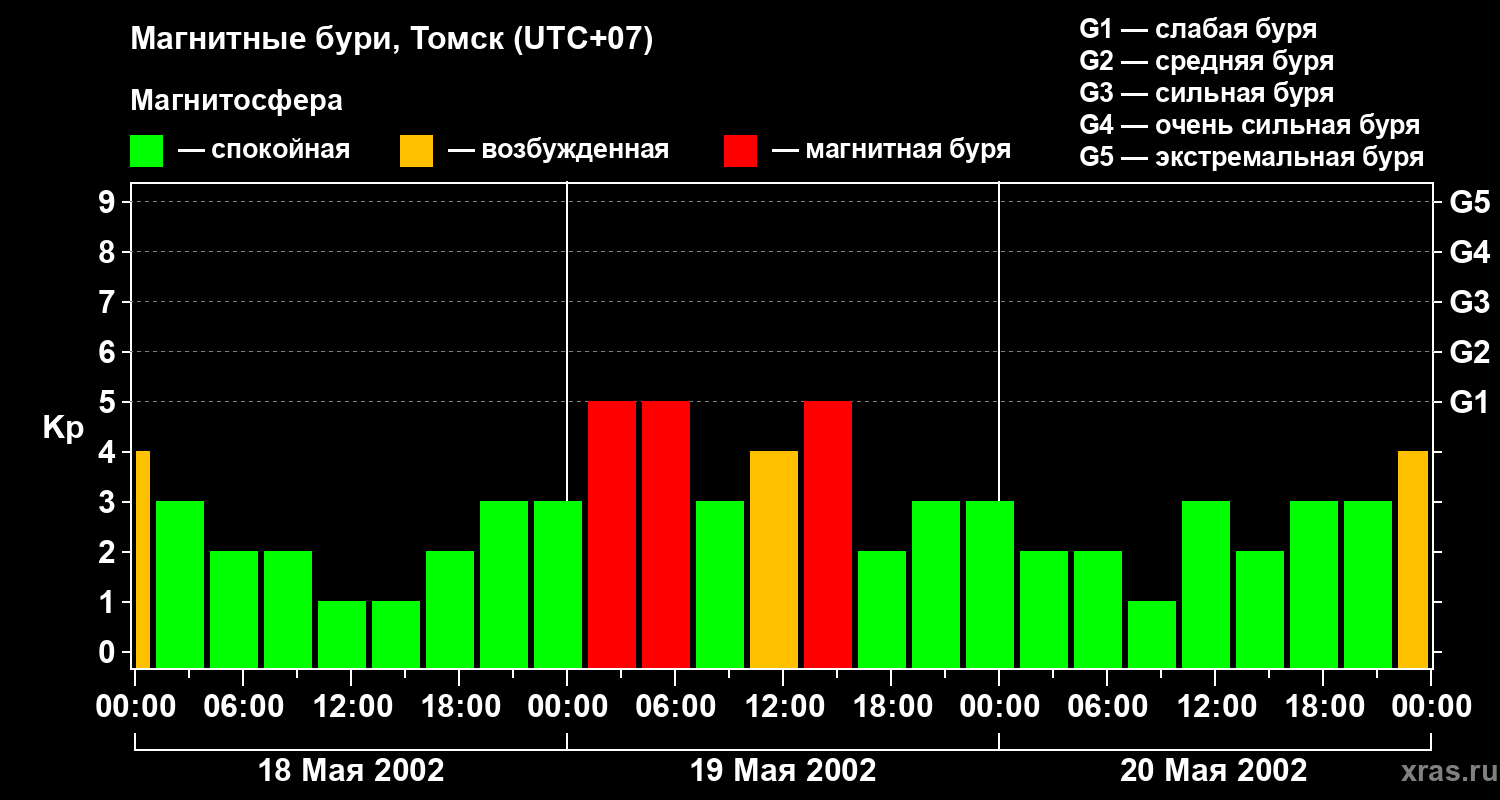 Изменения геомагнитного индекса Kp с 18 по 20 мая 2002 года для средних широт