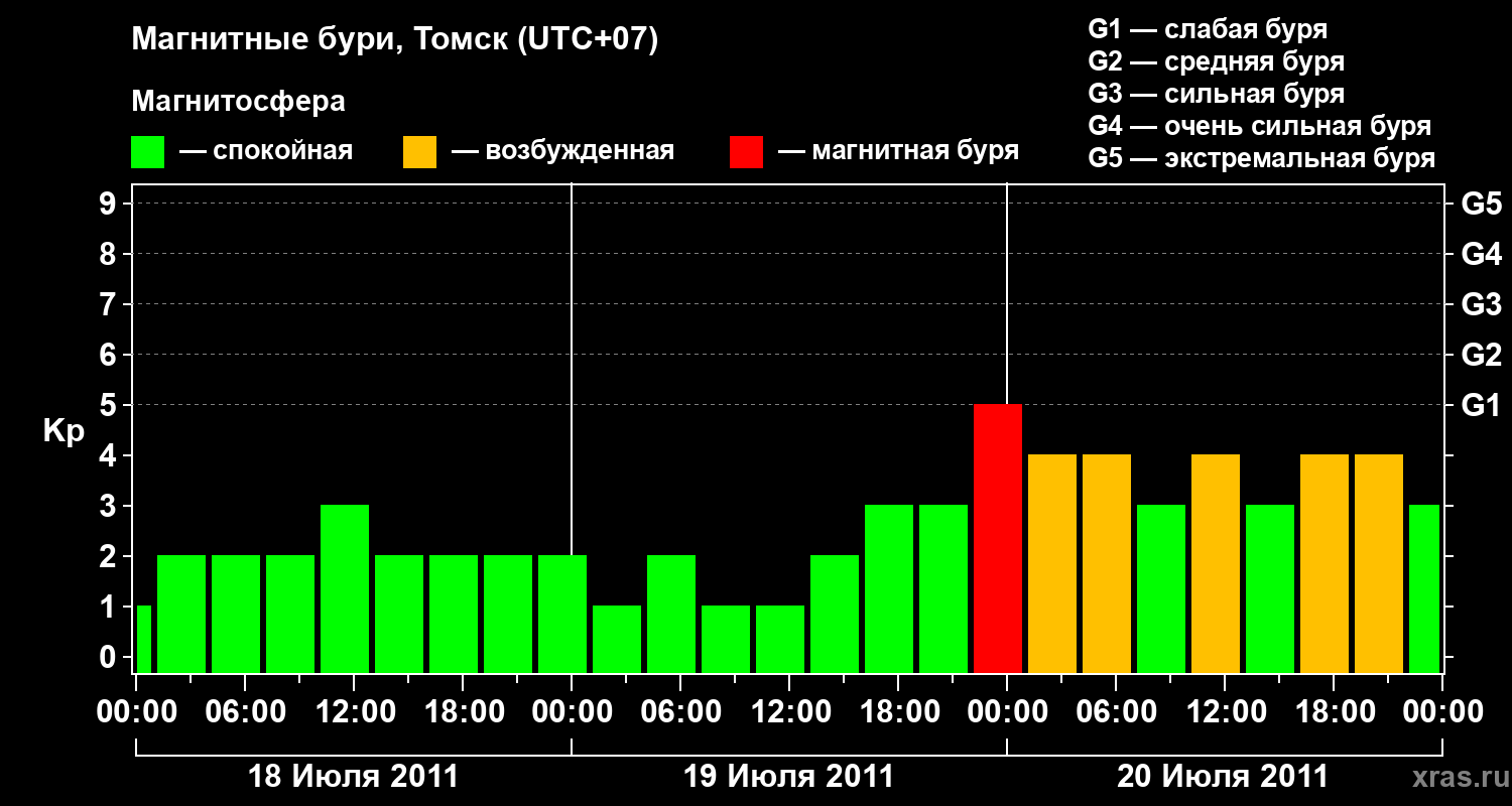 Изменения геомагнитного индекса Kp с 18 по 20 июля 2011 года для средних широт
