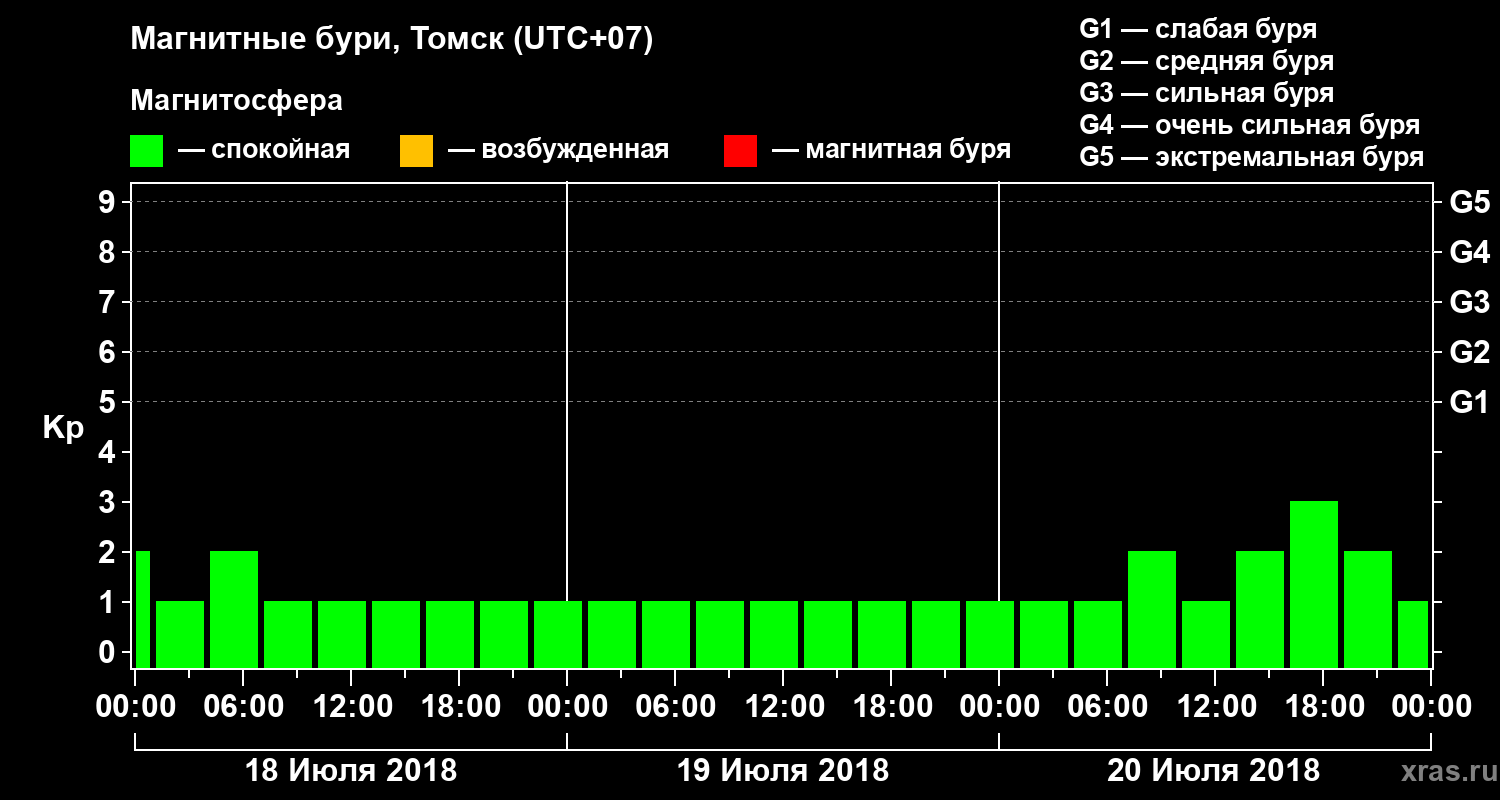 Изменения геомагнитного индекса Kp с 18 по 20 июля 2018 года для средних широт