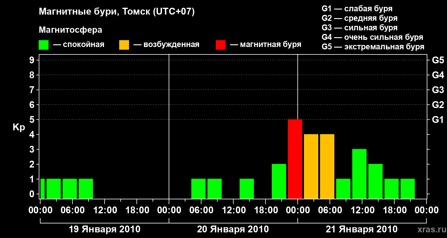 Изменения геомагнитного индекса Kp с 19 по 21 января 2010 года для средних широт