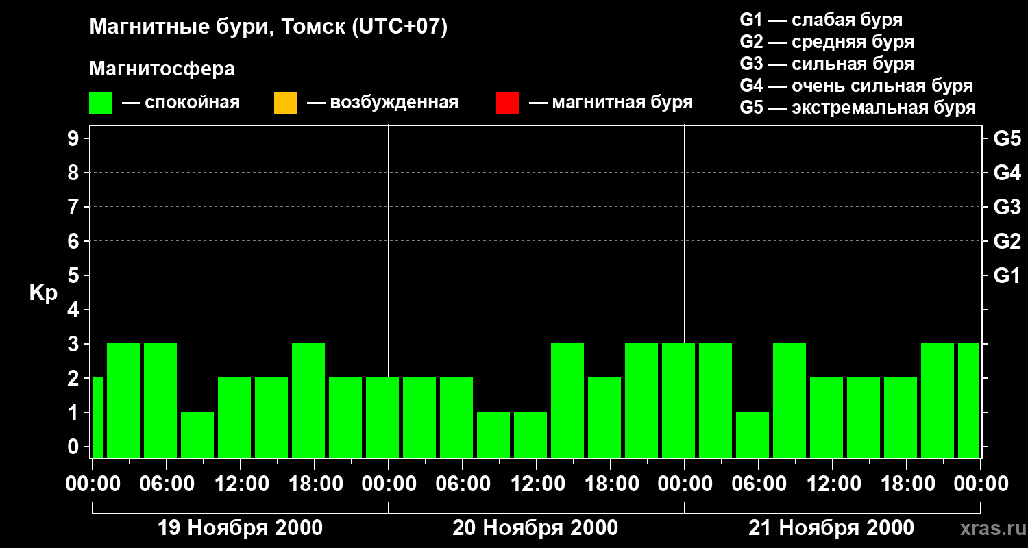Изменения геомагнитного индекса Kp с 19 по 21 ноября 2000 года для средних широт