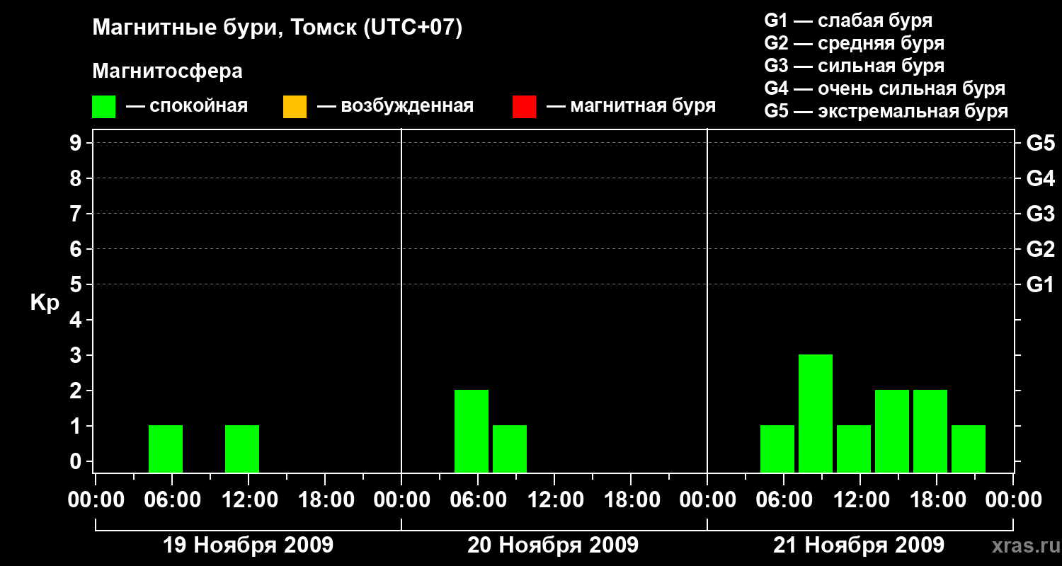 Изменения геомагнитного индекса Kp с 19 по 21 ноября 2009 года для средних широт