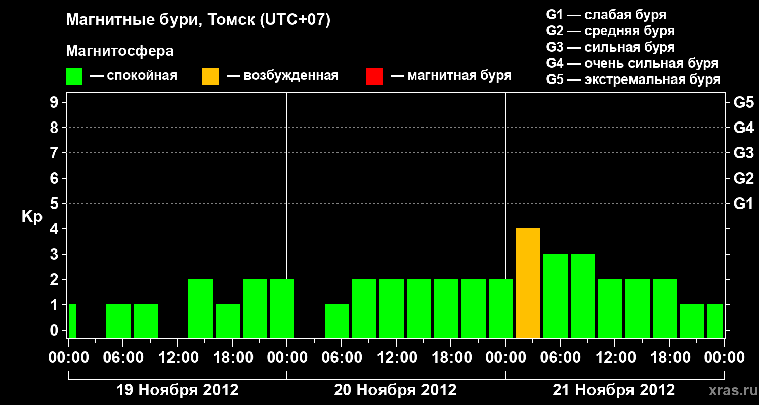 Изменения геомагнитного индекса Kp с 19 по 21 ноября 2012 года для средних широт