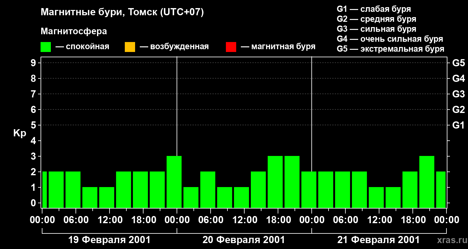 Изменения геомагнитного индекса Kp с 19 по 21 февраля 2001 года для средних широт