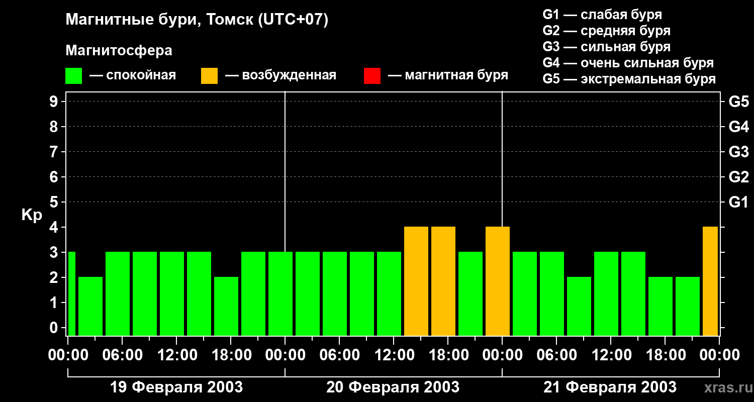 Изменения геомагнитного индекса Kp с 19 по 21 февраля 2003 года для средних широт