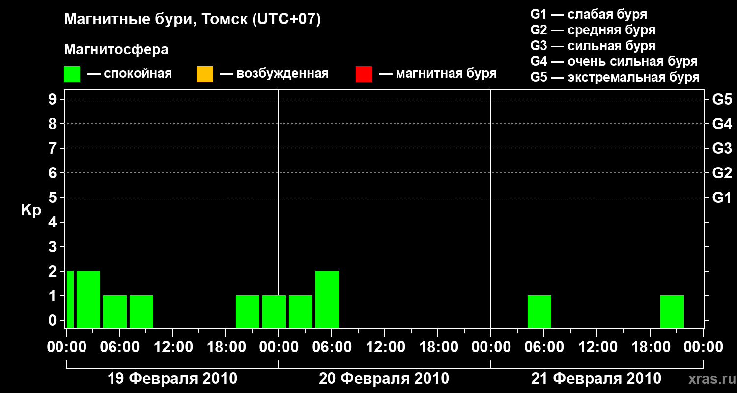 Изменения геомагнитного индекса Kp с 19 по 21 февраля 2010 года для средних широт