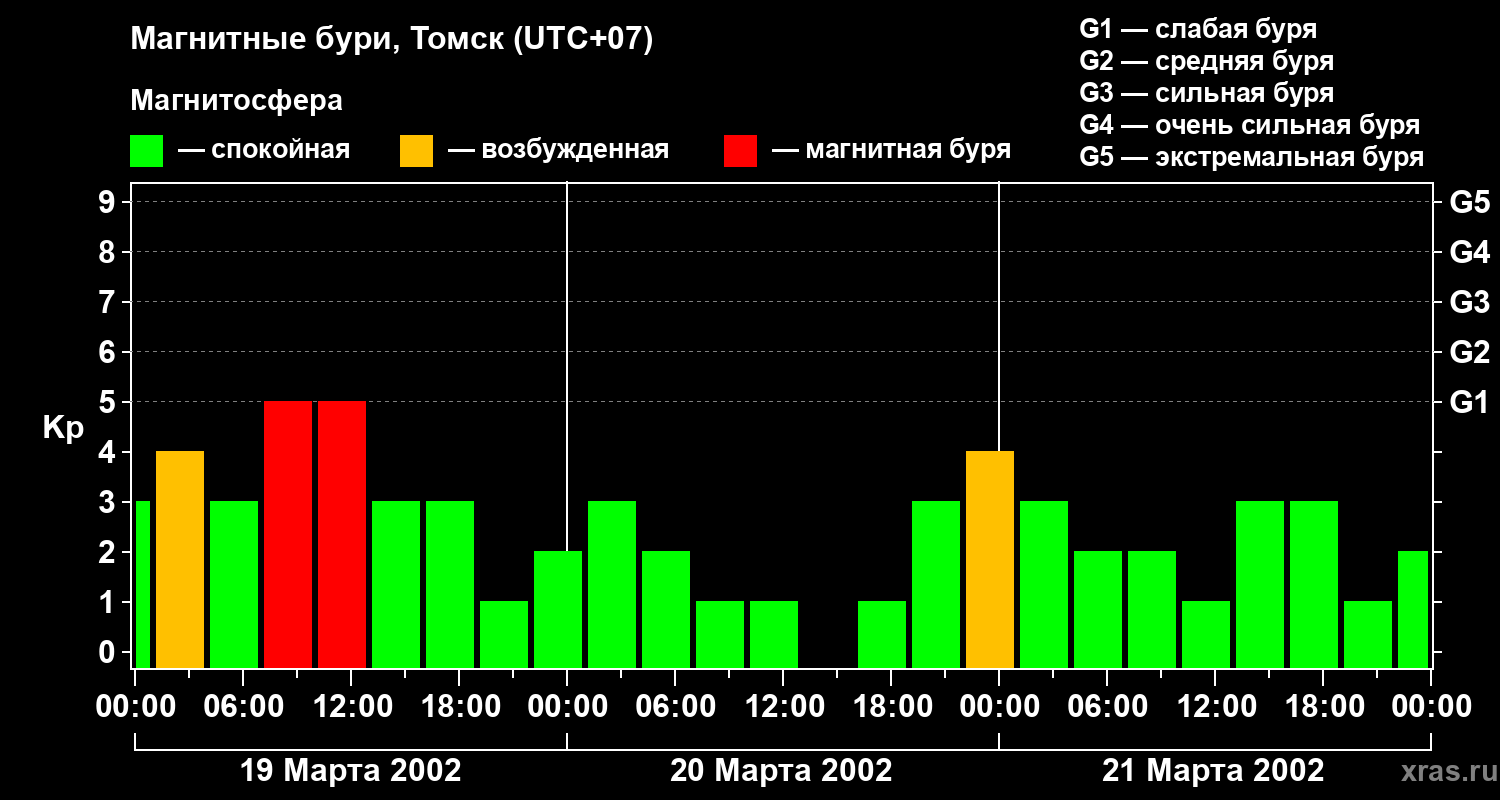 Изменения геомагнитного индекса Kp с 19 по 21 марта 2002 года для средних широт