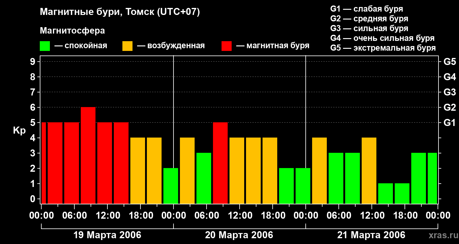 Изменения геомагнитного индекса Kp с 19 по 21 марта 2006 года для средних широт