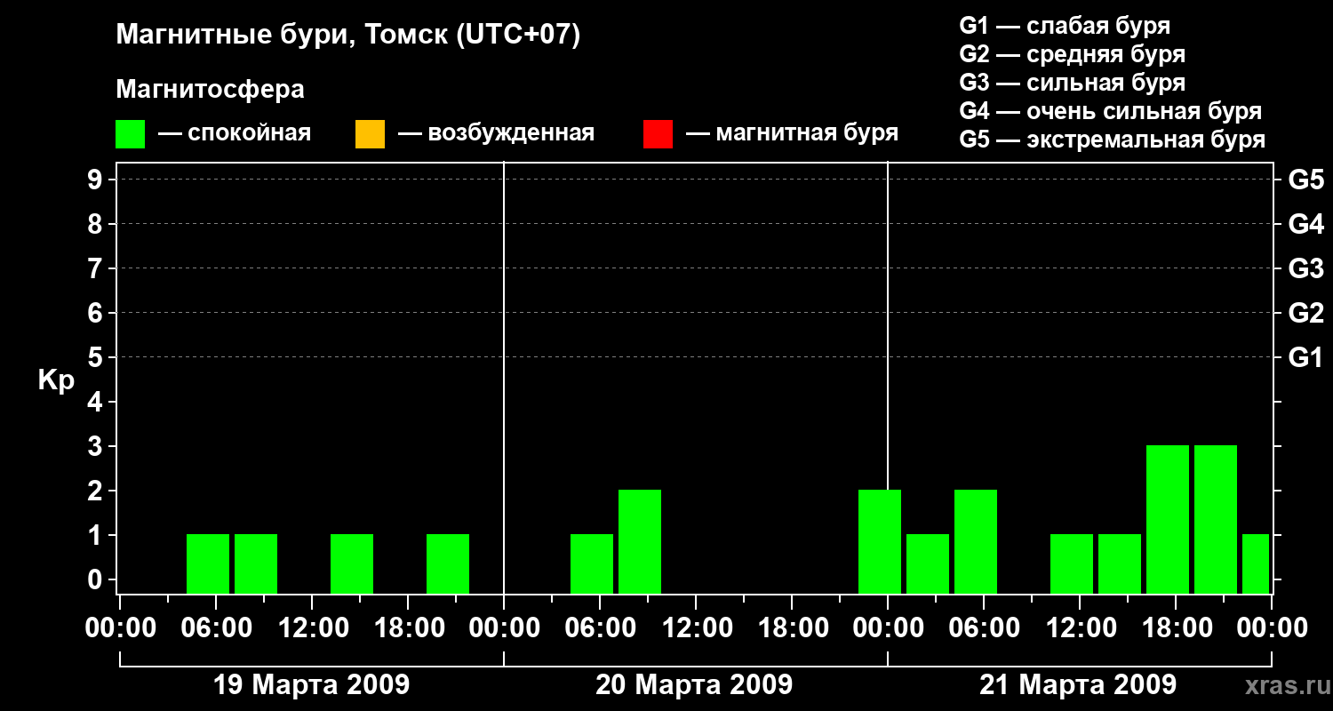 Изменения геомагнитного индекса Kp с 19 по 21 марта 2009 года для средних широт