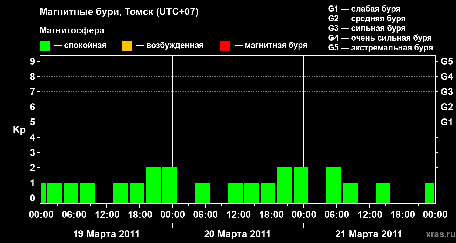 Изменения геомагнитного индекса Kp с 19 по 21 марта 2011 года для средних широт