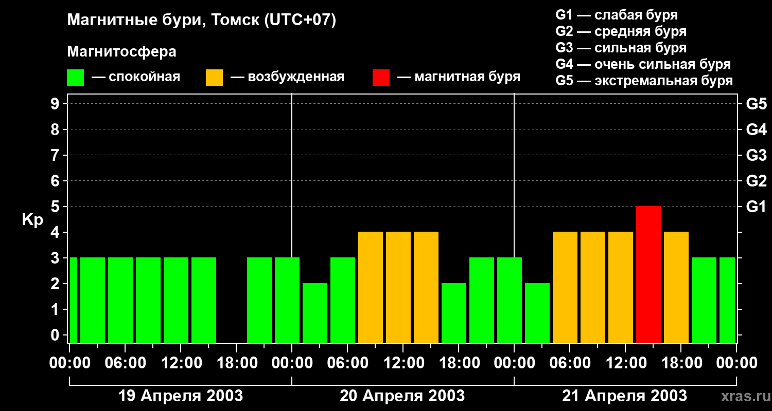 Изменения геомагнитного индекса Kp с 19 по 21 апреля 2003 года для средних широт