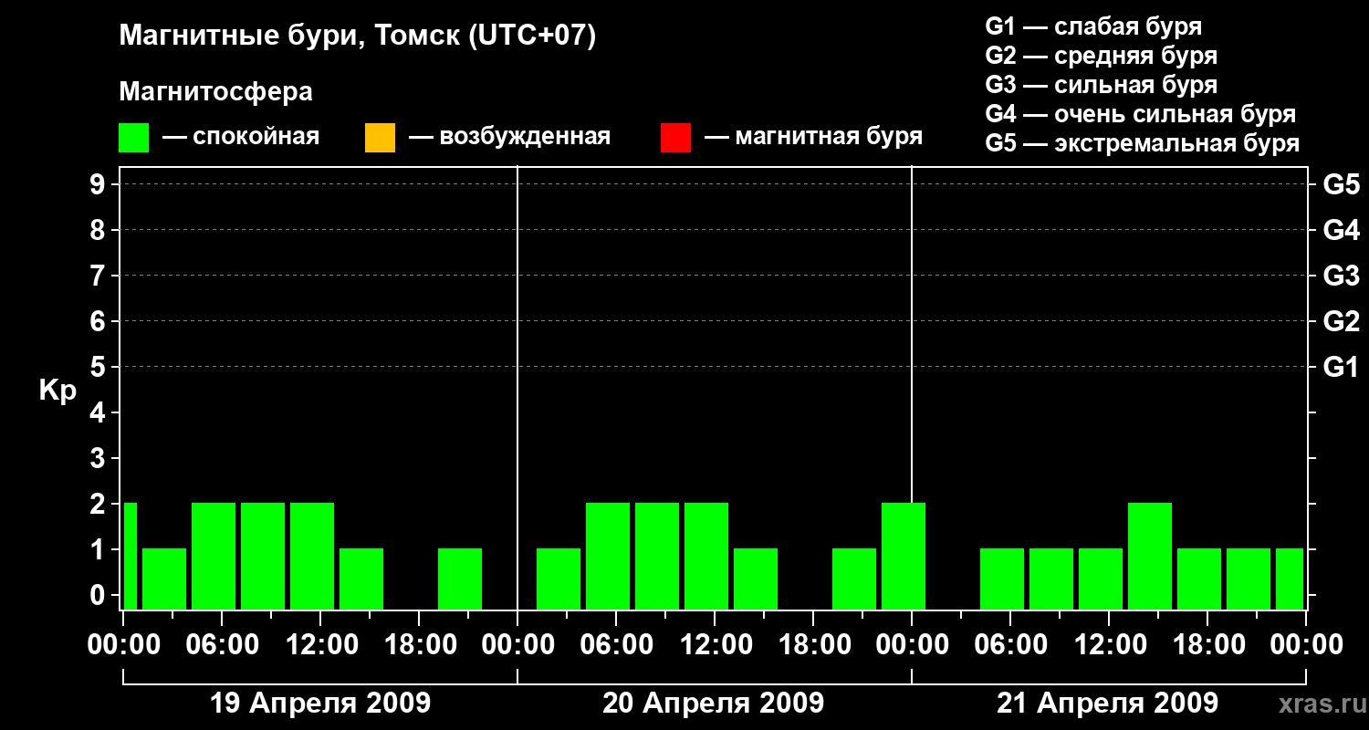 Изменения геомагнитного индекса Kp с 19 по 21 апреля 2009 года для средних широт