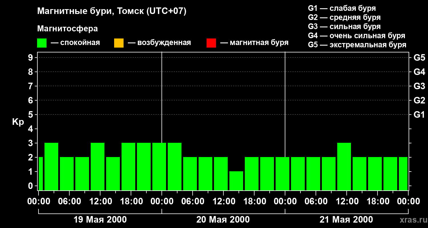 Изменения геомагнитного индекса Kp с 19 по 21 мая 2000 года для средних широт